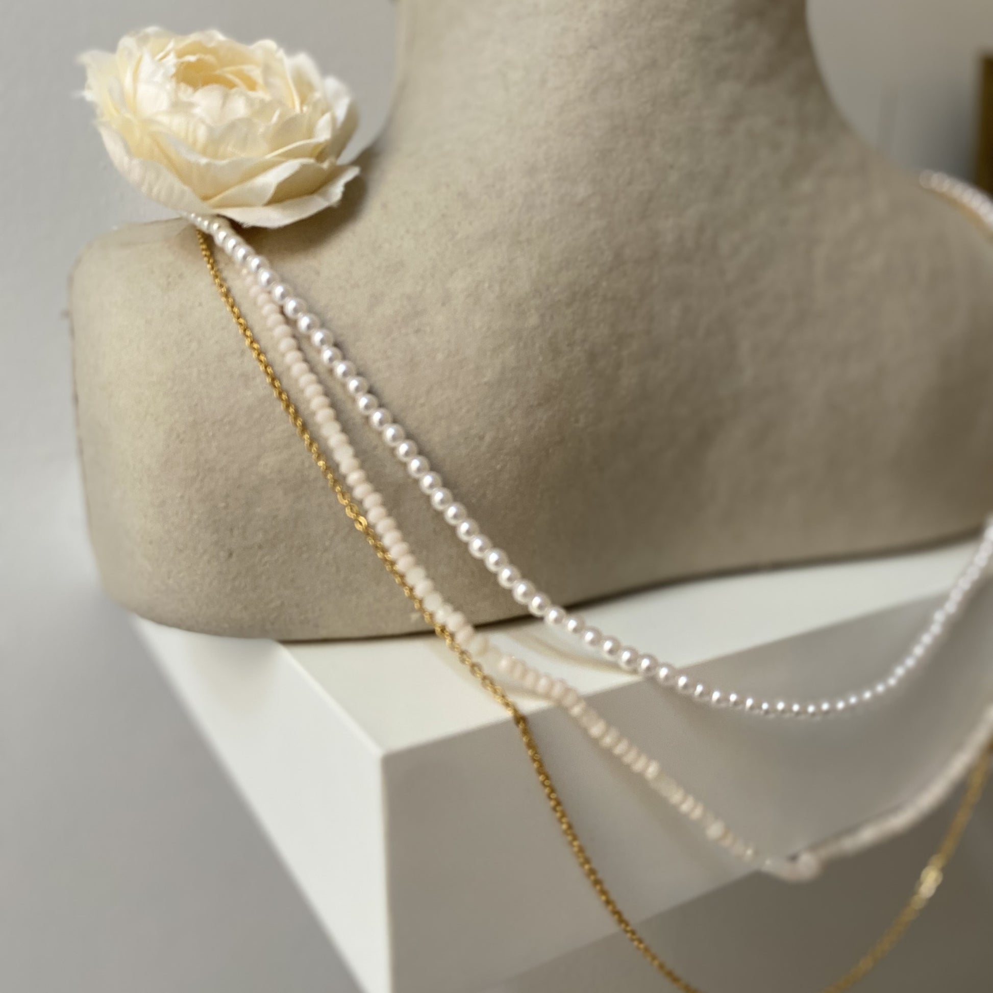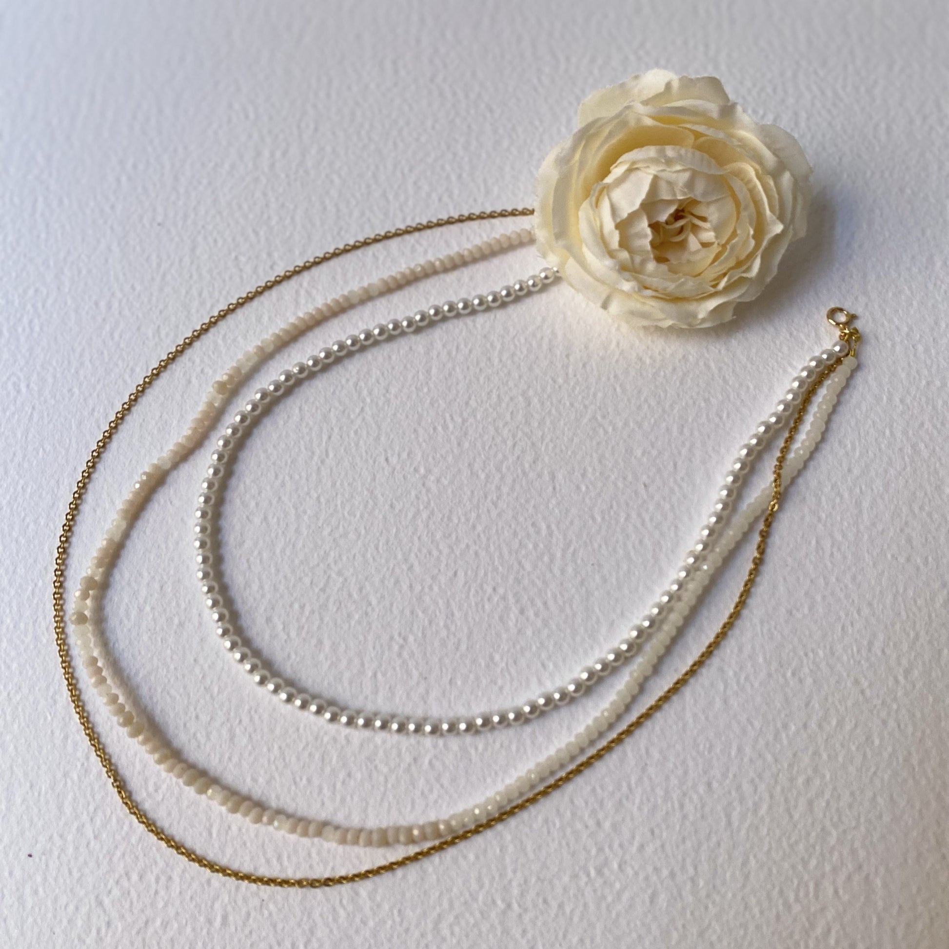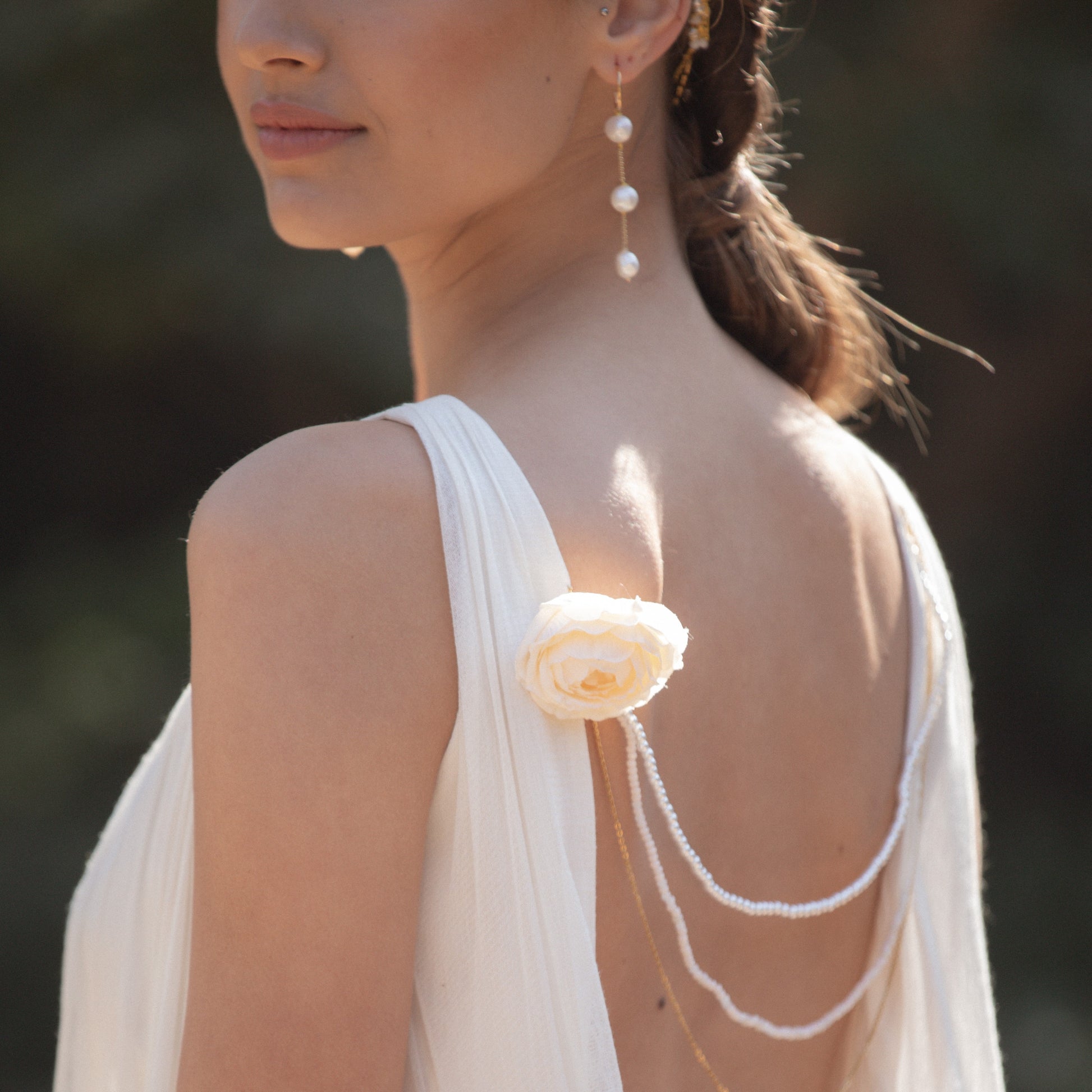 Dress accessory, consists of 3 strips: a chain, a strip of white minerals and another of mini pearls, with a fabric flower that will be on the side that you decide, you can place it on your dress as one more accessory to give it a distinctive touch.