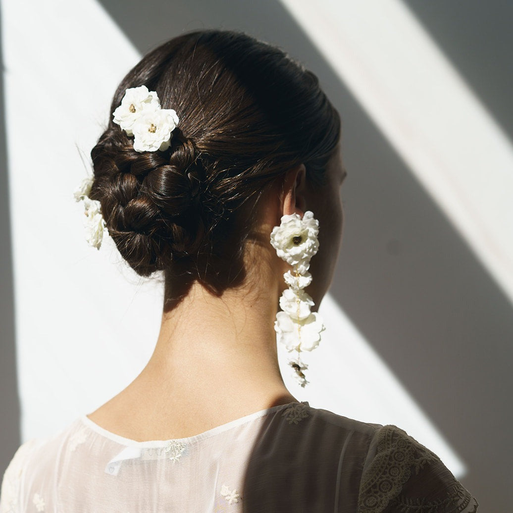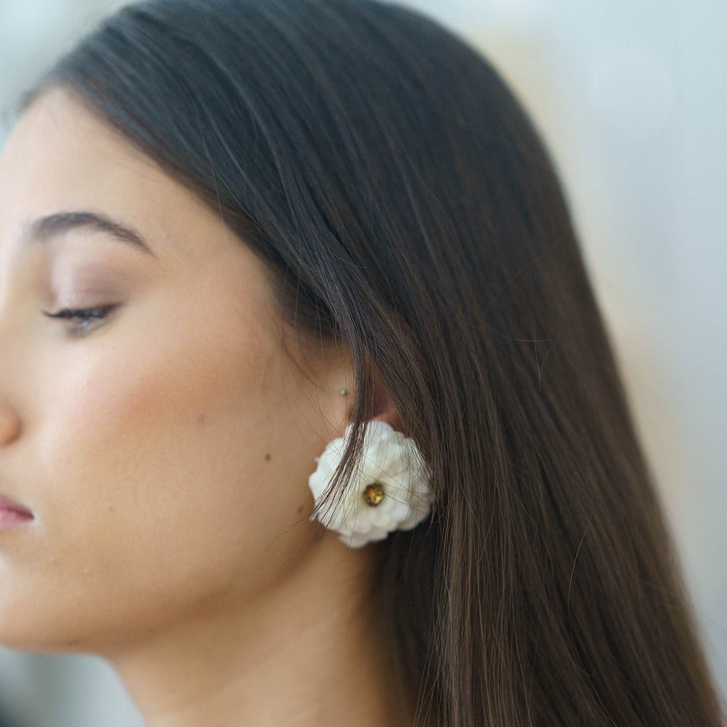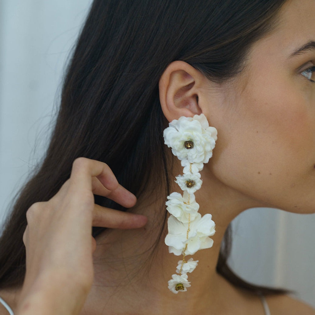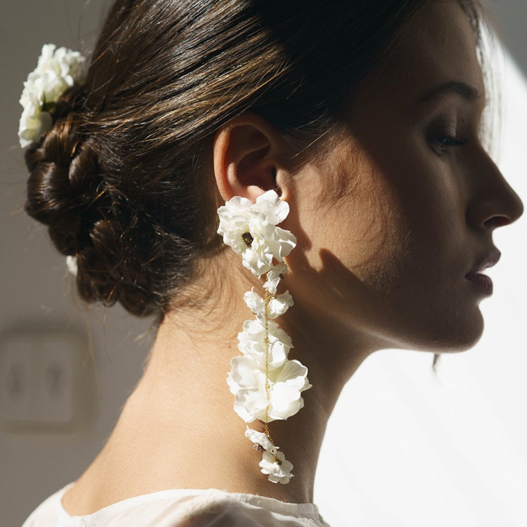 The asymmetrical white floral earrings offer a striking floral ballet.
