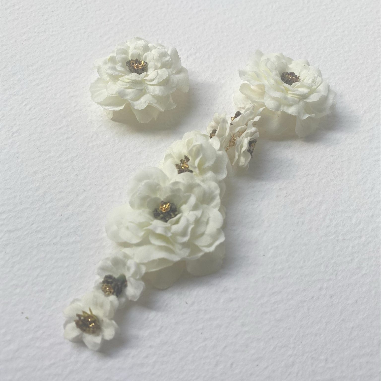 Asymmetrical Harmony: These earrings challenge norms with their creative asymmetry. On one side, a profusion of white flowers of different sizes dance in perfect harmony, while on the other, its single flower becomes the centerpiece, standing out with its singular elegance. This duality adds a touch of modernity and creativity to your style.