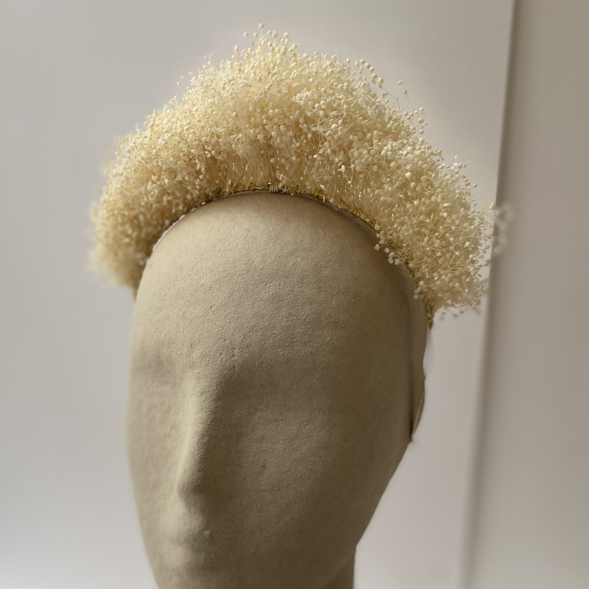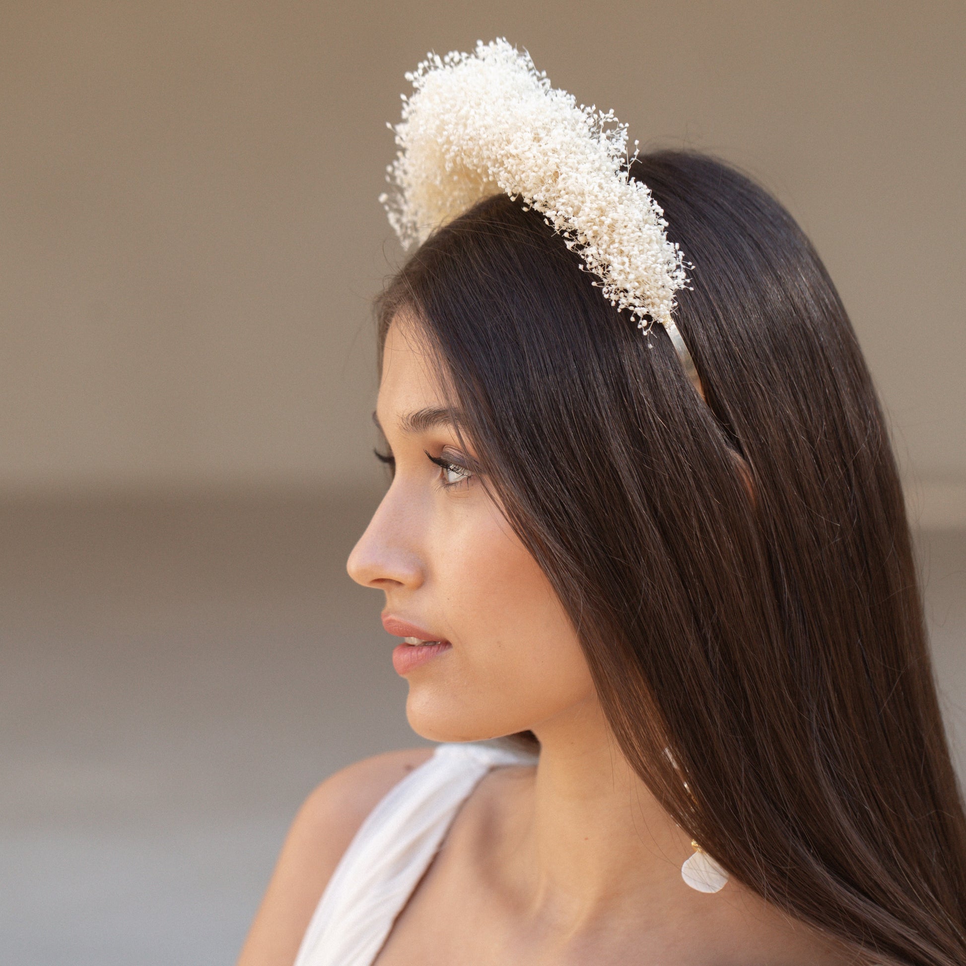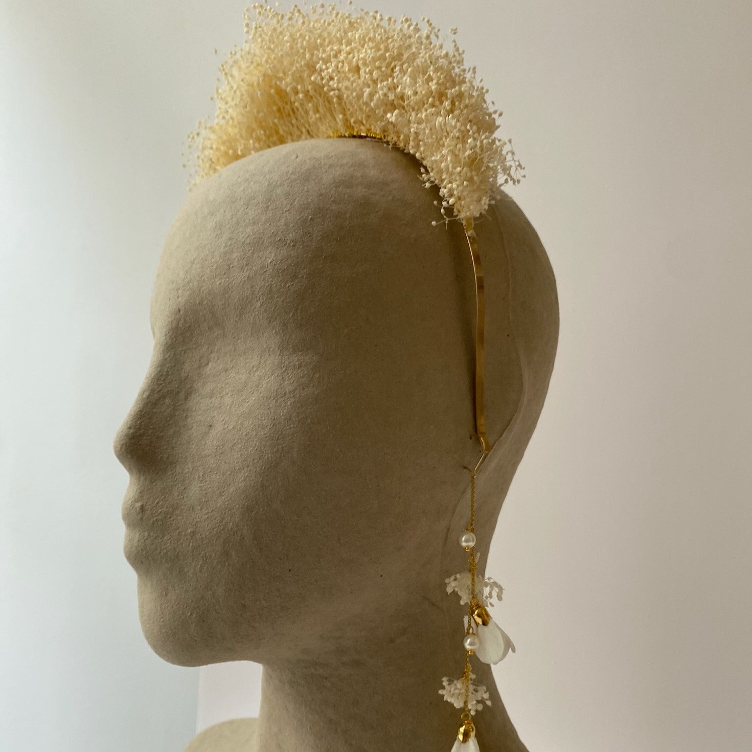 A Yes to elegant maximalism for the coolest and most daring. A high-impact headband as the protagonist among all the wedding details. Composed by mini paniculata in surprising height.