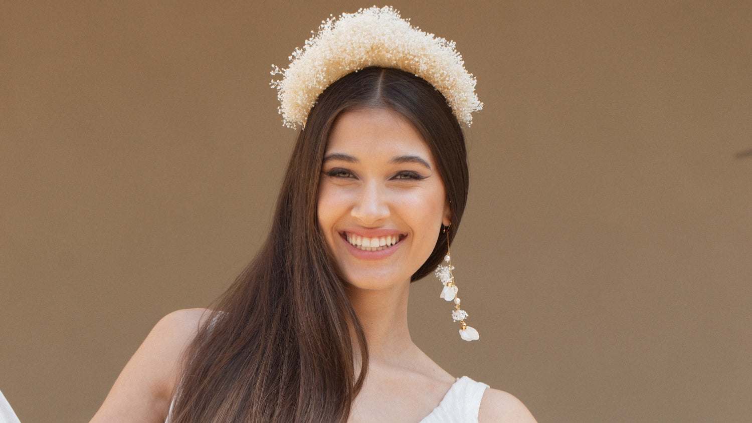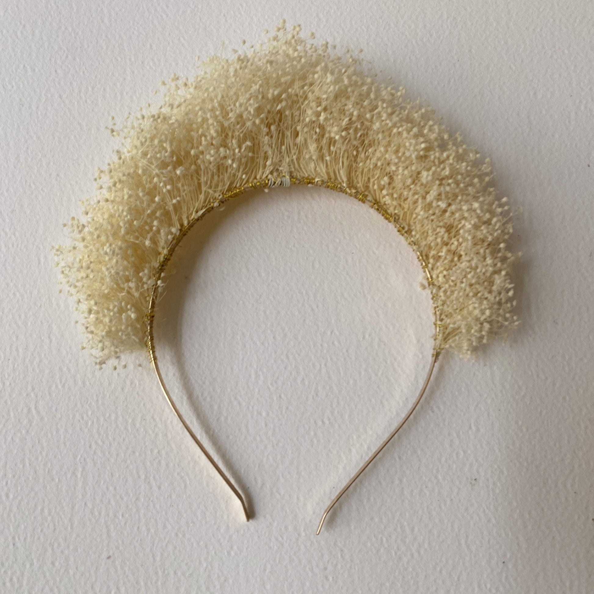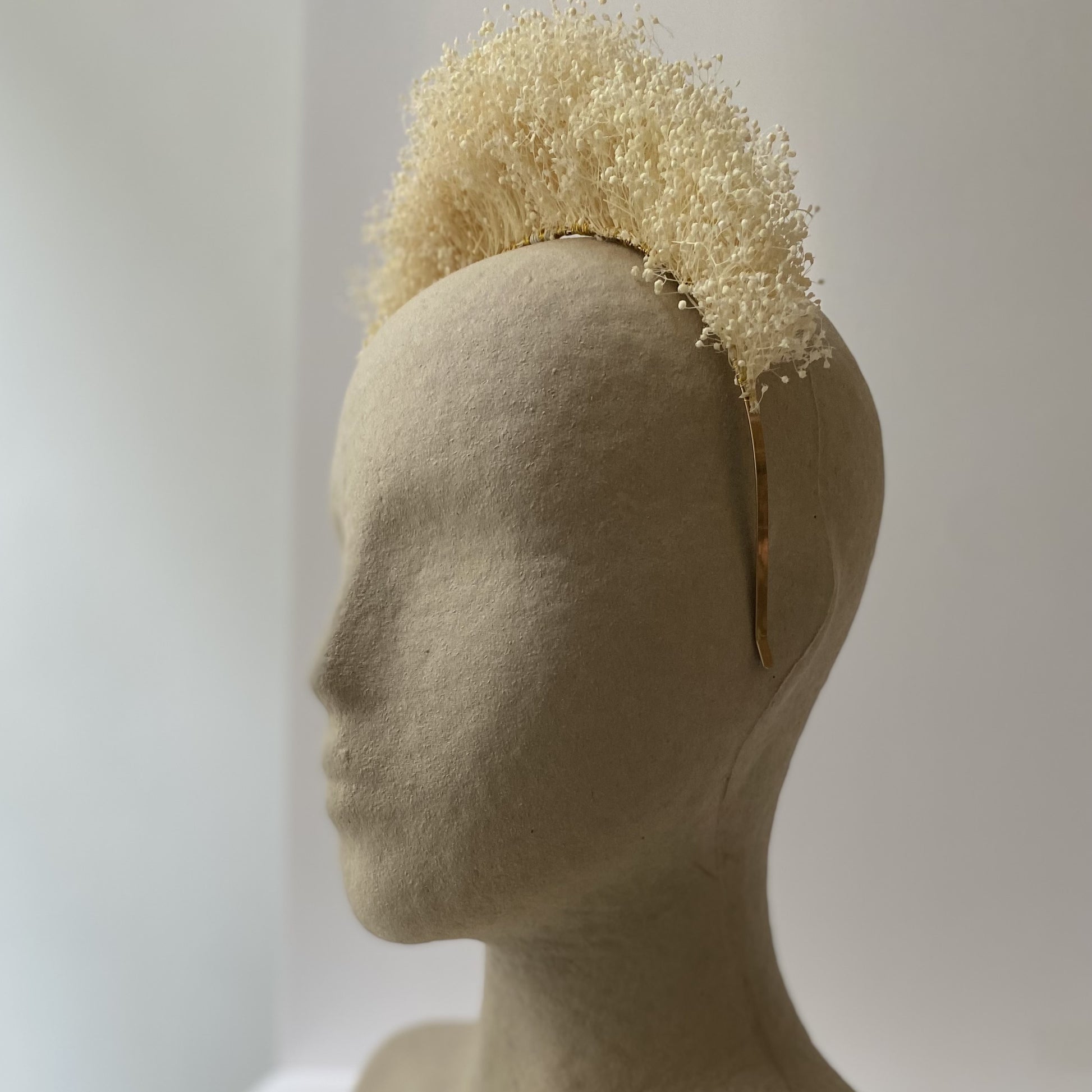A Yes to elegant maximalism for the coolest and most daring. A high-impact headband as the protagonist among all the wedding details. Composed by mini paniculata in surprising height.