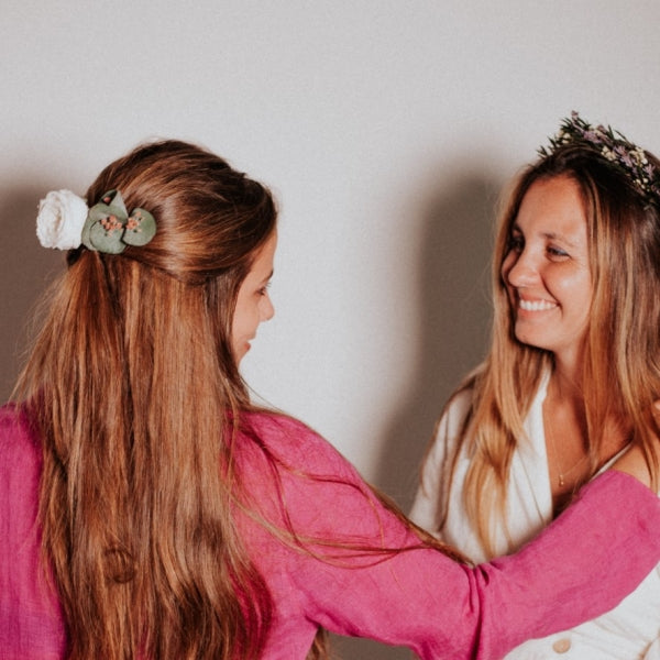 Fabriqué avec de l'eucalyptus stabilisé et du paniculata rose, au centre culminant le peigne une rose sauvage blanche.