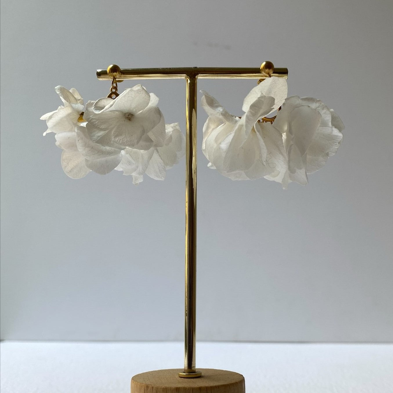 · Pompon Hortensia Stabilisé : Chaque boucle d'oreille présente un pompon délicatement réalisé avec des feuilles d'hortensia stabilisées. La technique de conservation garantit que chaque feuille conserve sa forme et sa couleur d'origine, créant un effet doux et éthéré.