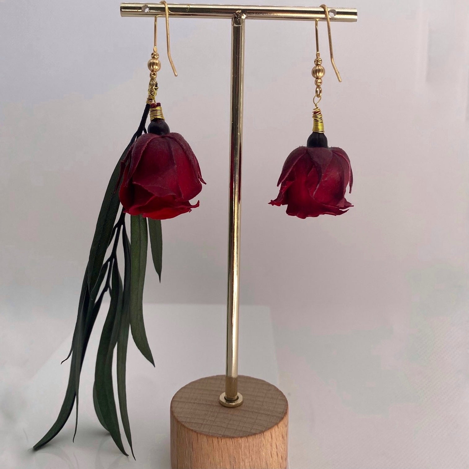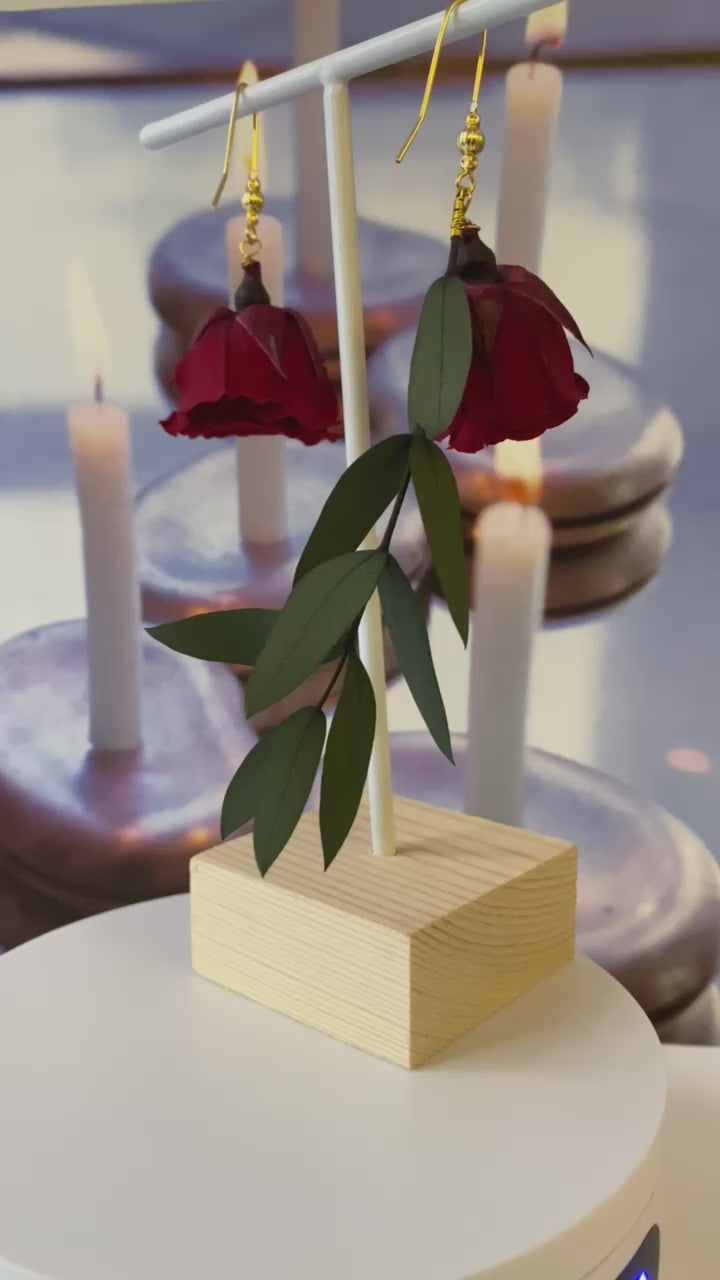 Boucles d'oreilles très raffinées, composées de roses type princesse stabilisées et de feuilles vertes stabilisées, elles sont asymétriques donc un côté sera long et l'autre court, à vous de choisir.