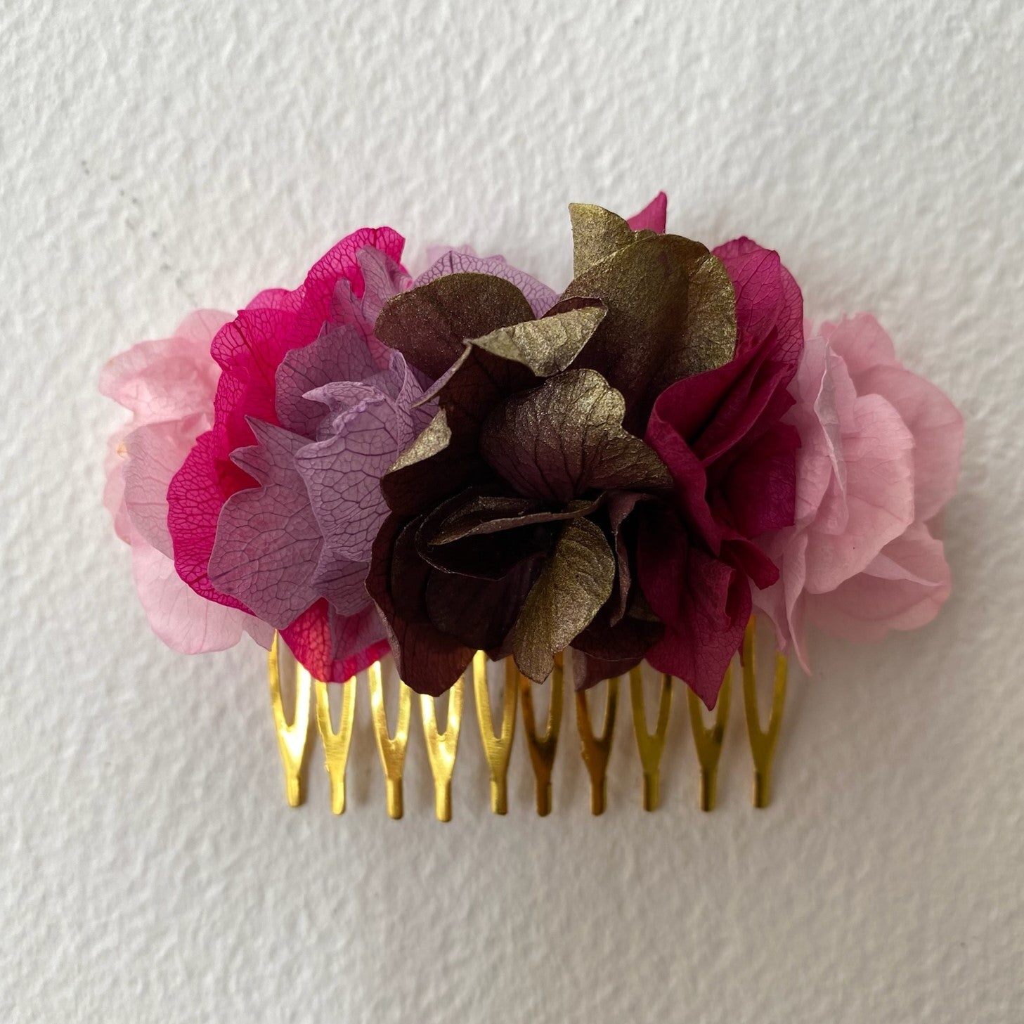 Peigne à porter avec un chignon ou semi-chignon composé de 5 pompons fleurs dans les tons de rose, rose pâle, rose fushia, lilas, modéré et rose vin, un arc-en-ciel de couleur qui illuminera vos cheveux.