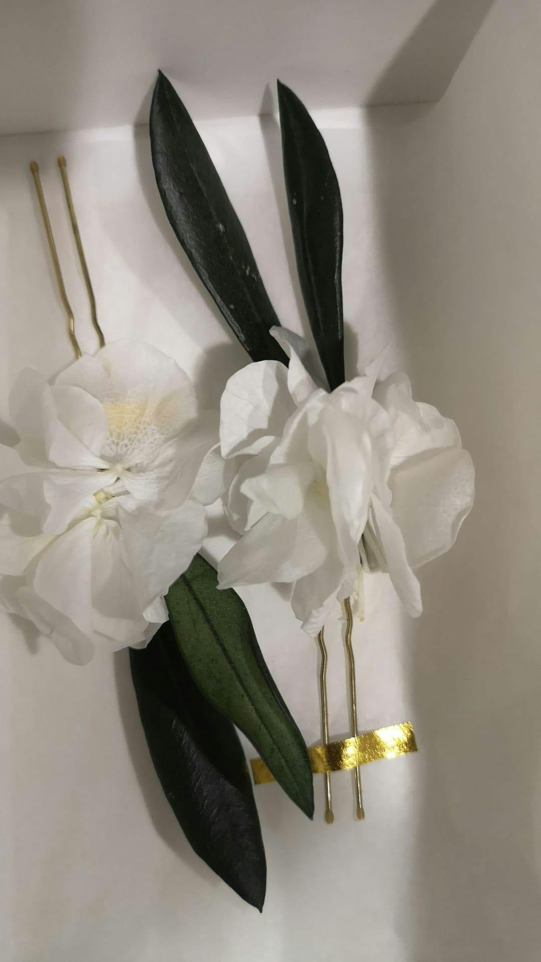 Collar tipo chocker de hortensia preservada en color blanco y con pequeño y delicado detalle de hilo dorado al rededor del pétalo que causa un efecto de rostro iluminado y radiante.