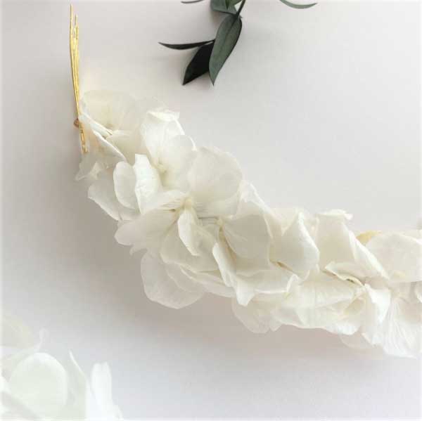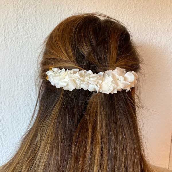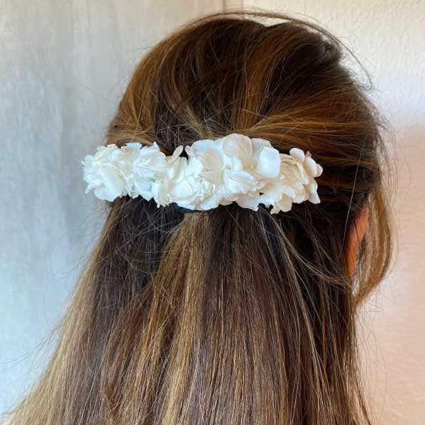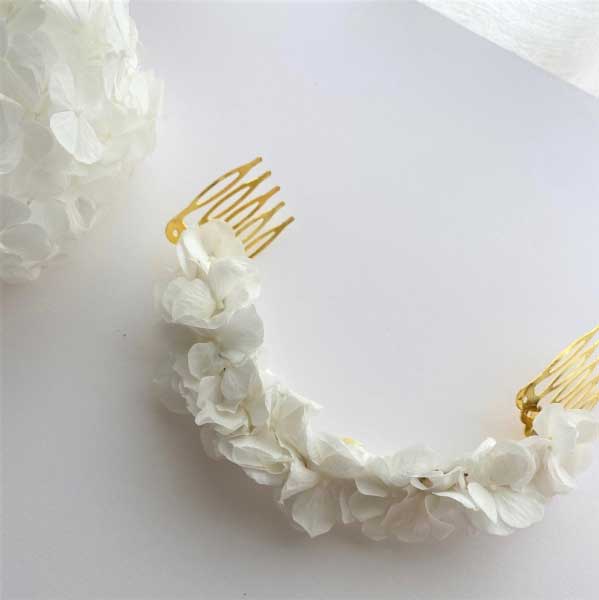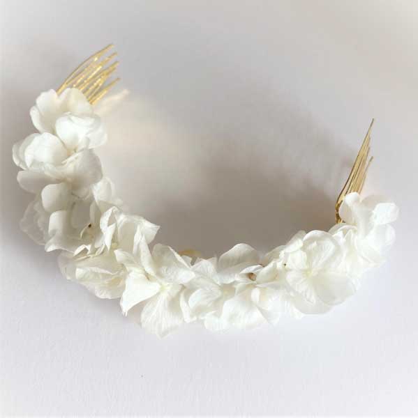 Doble peineta hecha con pétalos de hortensia preservada, un sueño.